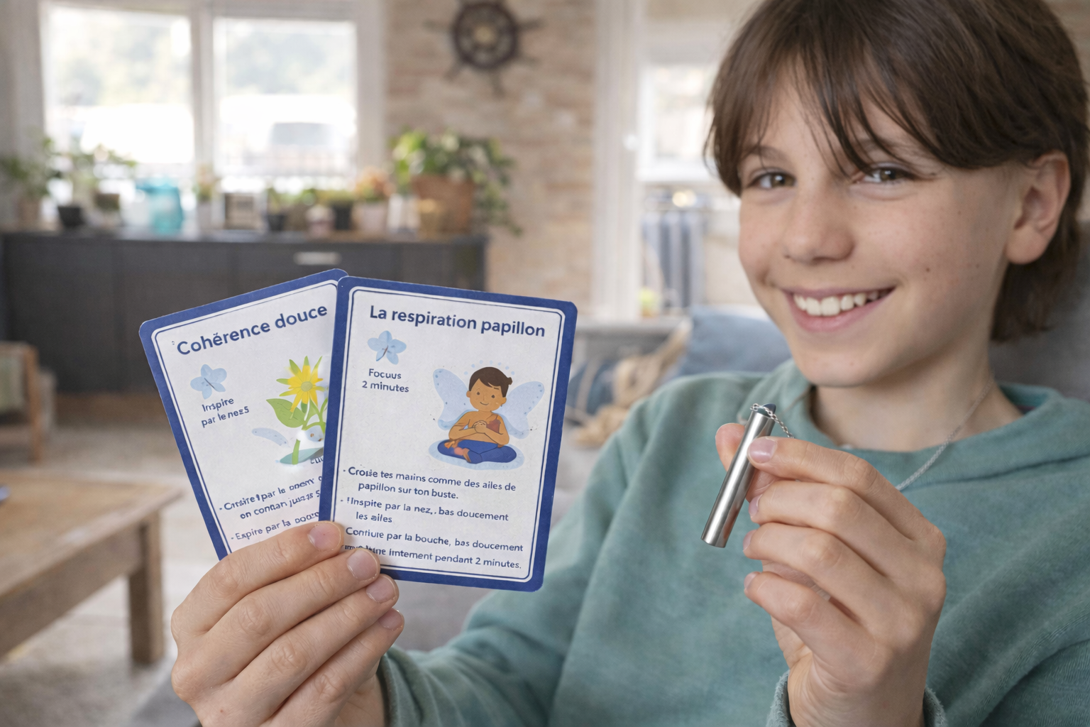 Cartes illustrées, simples, concrètes basées sur de la sophrologie, de la coherence cardiaque et présentées de façon ludique.